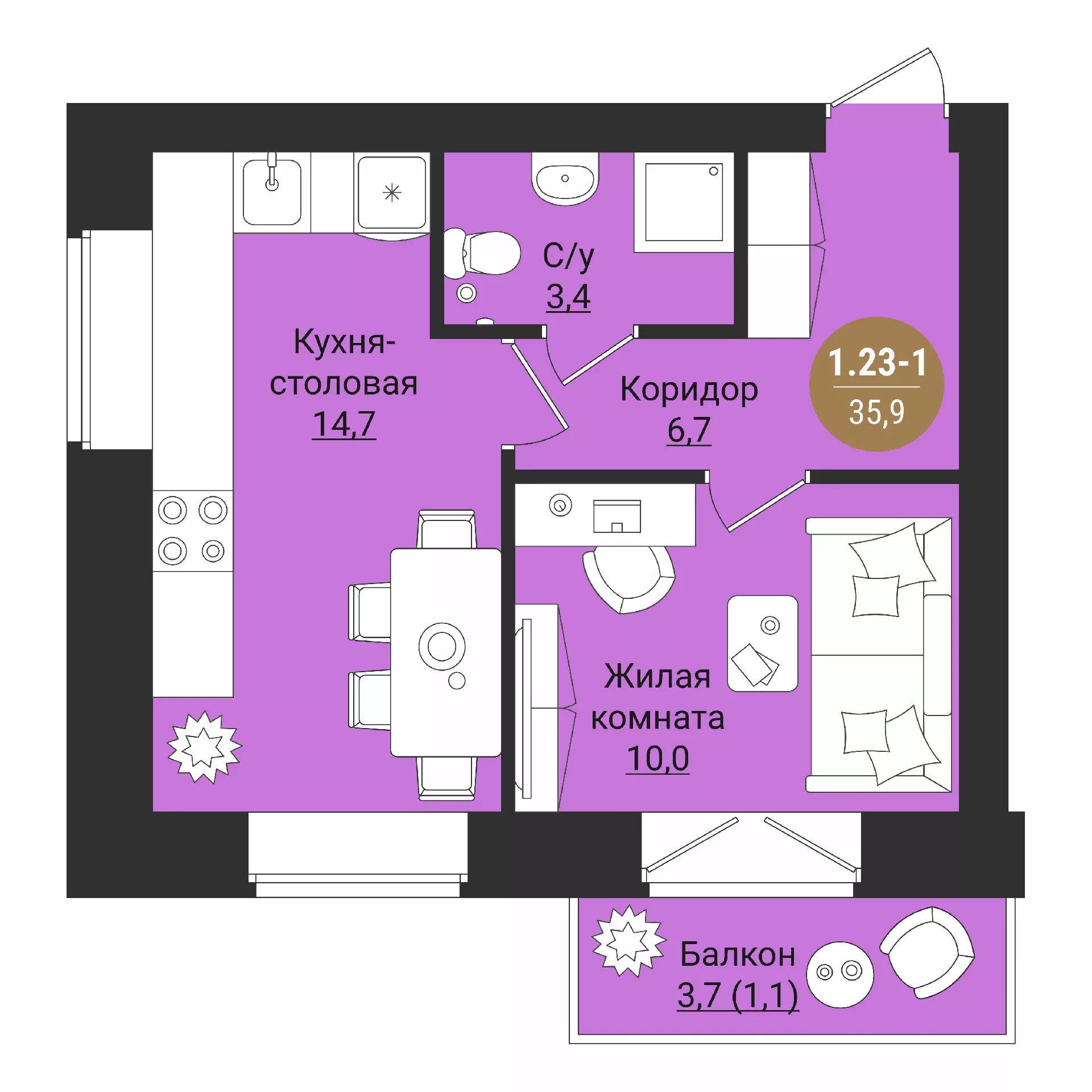 1-х комнатная квартира 35.9 м2