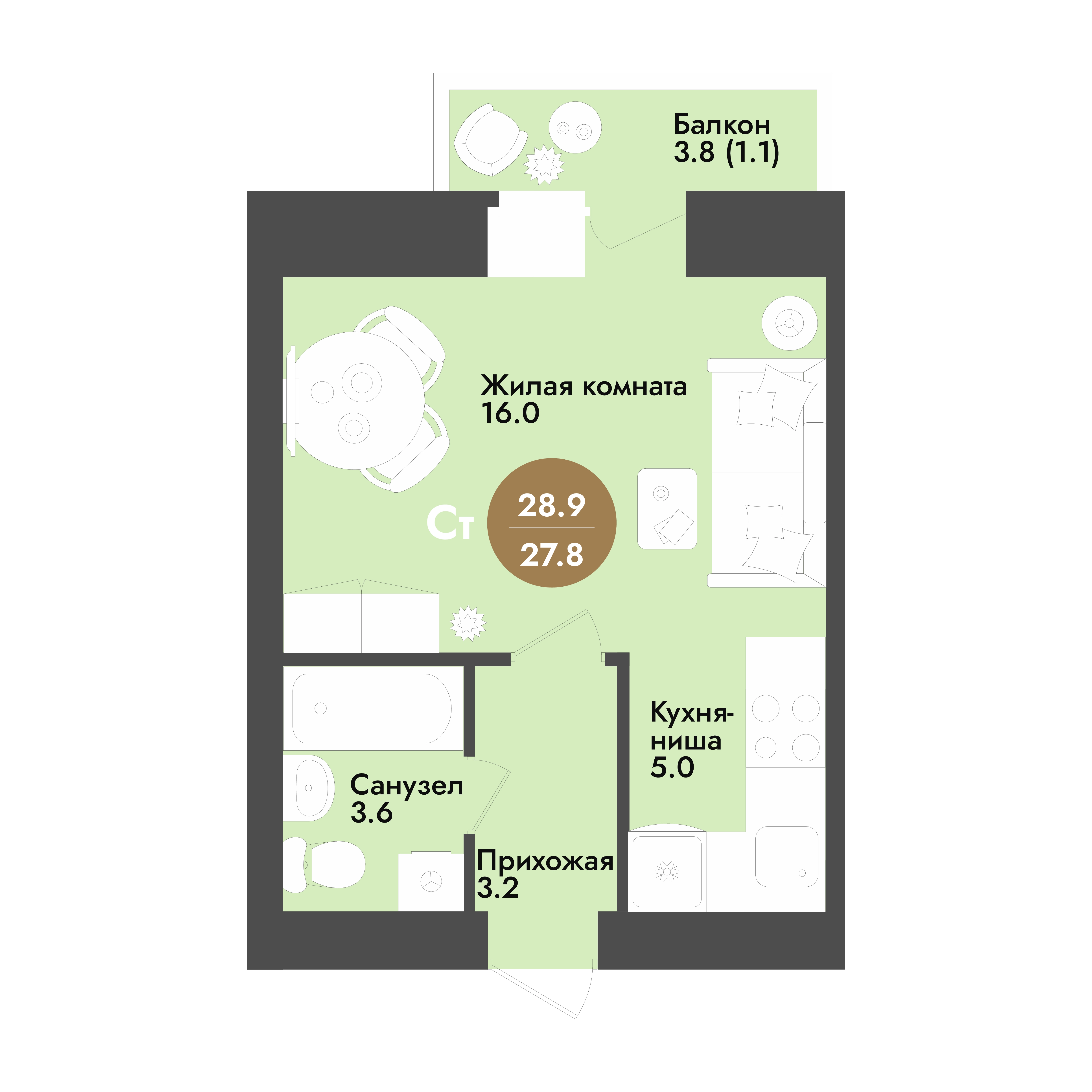 Студия, 28.8м2